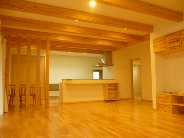広々とした空間にしたかったのでリビングは天井を高めに作って頂き、床はかば桜の無垢材でとても気持ちがいいです。食事をするダイニングは少し仕切りが欲しかったので格子を付けて頂きました。とても気に入っています。