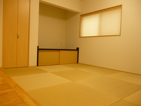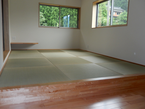 かねてから寝るときはベッドより布団でという強い気持ちがあり、寝室は畳の小上がりにしてもらいました。小さなTV台や化粧カウンターも作って頂きました。 また、棟梁のご厚意で作ってもらったかば桜の框がとてもいい感じで気に入っています。