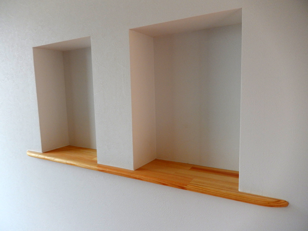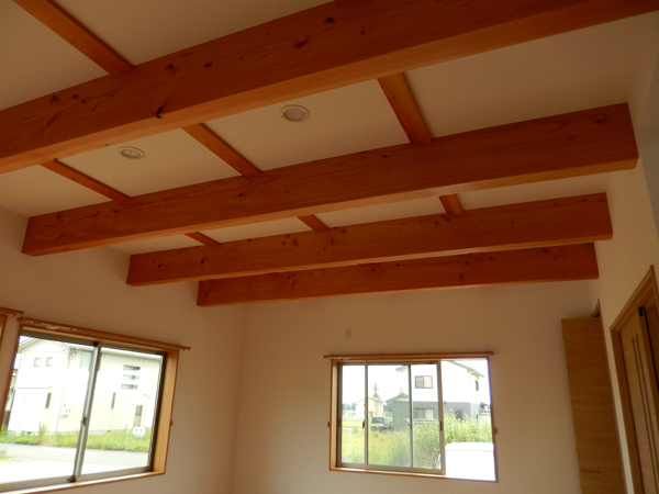 シンプルモダンな外観。 あえて梁をむき出しにすることで、天井が高く、広々とした空間を演出してくれます。 木目が美しい玄関扉や飾り棚、シーリングファンの照明など、随所にこだわった居心地の良い住まいに仕上がりました。